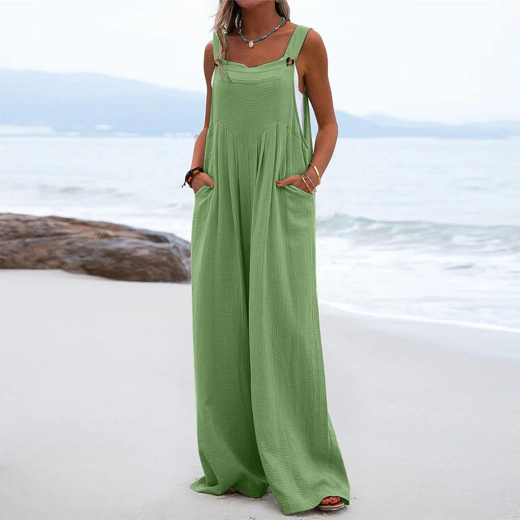 Damski modny kombinezon casualowy w jednolitym kolorze, luźny, bez rękawów, z kieszeniami