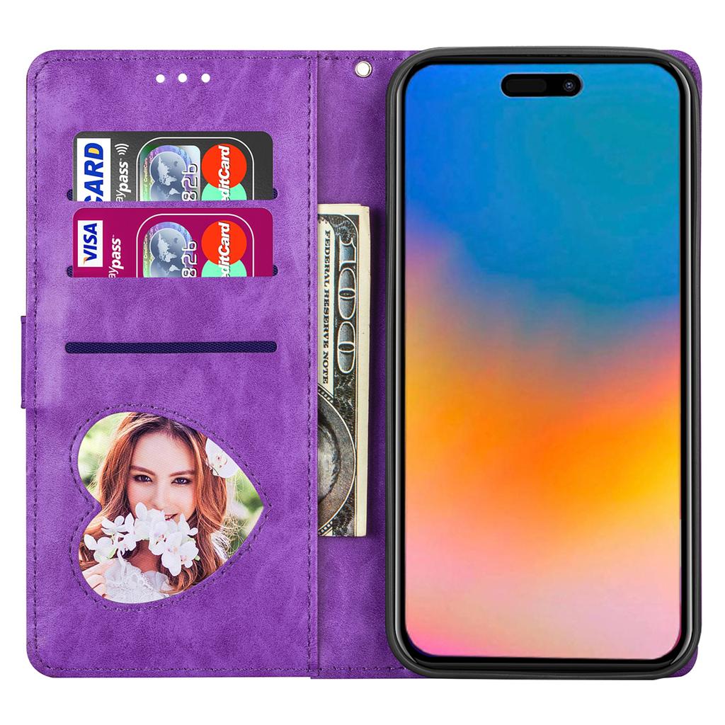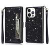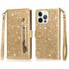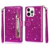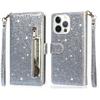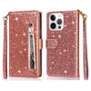 Etui z podstawką z brokatem na iPhone 16 Pro, skórzany pokrowiec na telefon z kieszonką na zamek błyskawiczny