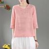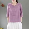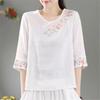 Poczuj najwyższy komfort i styl dzięki tej damskiej letniej koszulce w stylu etnicznym. Wykonany z wysokiej jakości mieszanki bawełny i lnu, ten top ma misterne hafty, które dodają nuty etnicznego uroku.. Okrągły dekolt i krótkie rękawy zapewniają swobodne i przewiewne uczucie, idealne na ciepłą pogodę.. Zaprojektowana w luźnym kroju, ta koszulka zapewnia swobodę ruchów i swobodną sylwetkę, co czyni ją idealnym wyborem na codzienne wyjścia lub relaksujące dni w domu.. Połącz tradycję i komfort dzięki temu wszechstronnemu elementowi.