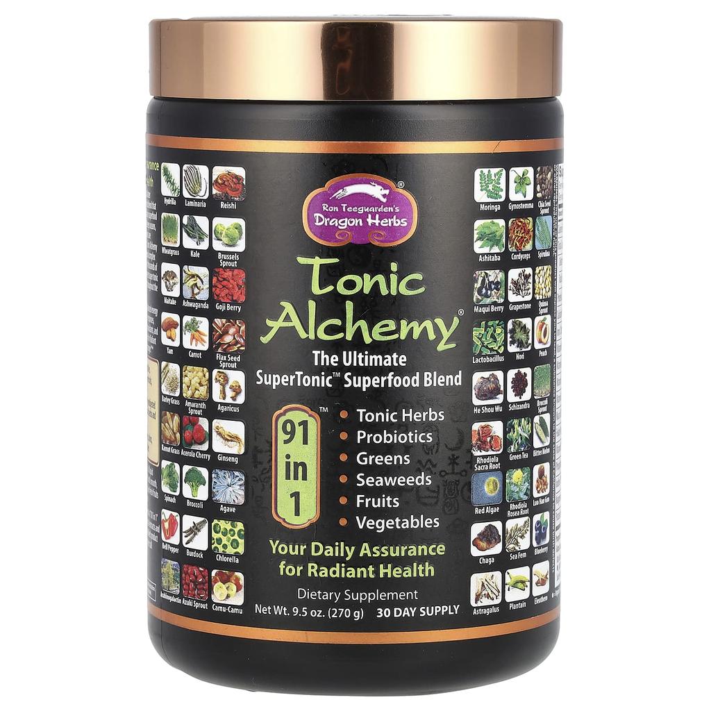Product Description: 91 in 1™ Tonic HerbsProbiotic GreensSeaweed FruitsVegetables Supplements91 in 1™ for your daily 'Happy Health' Herbalist Ron Chiguaden has created a delicious superfood blend based on ancient Asian health-boosting principles. This blend provides the widest range of superior nutrients of any superfood product in the world. From the highest altitudes and deep oceans to the deserts and jungles, Tonic Alchemy contains only the finest ingredients available. With 91 amazing ingredients, Tonic Alchemy provides the ultimate natural energy-boosting nutrient complex and energy source in one glass. Tonic Alchemy is a source of thousands of phytonutrients. It also contains 20 of the world's best supertonic herbs. Tonic herbs are consumed daily around the world to promote 'Happy Health'. Tonic Alchemy nourishes the body in a variety of ways, including by increasing balanced energy and vitality, supporting detoxification, enhancing immune response, and increasing activity and antioxidant levels. Tonic Alchemy can be the dietary foundation of Radiant Health, which is defined in Asia as "a health that is completely "my own"." **100% Vegan 20 Key Tonic Herbs (Premium Reishi, Chaga, Goji Berry, Schisandra, Hong Kyung Cheon and Polygonum multiflorum) 6 Wild Seaweeds 7 Probiotic Microorganisms 71 Herbs, Vegetables, Superfoods, Superfruits and Super Sprouts 11 Probiotic-Predigested (Fermented) Tonic Herbs and Superfoods No Preservatives, Colors, Flavors or Additives