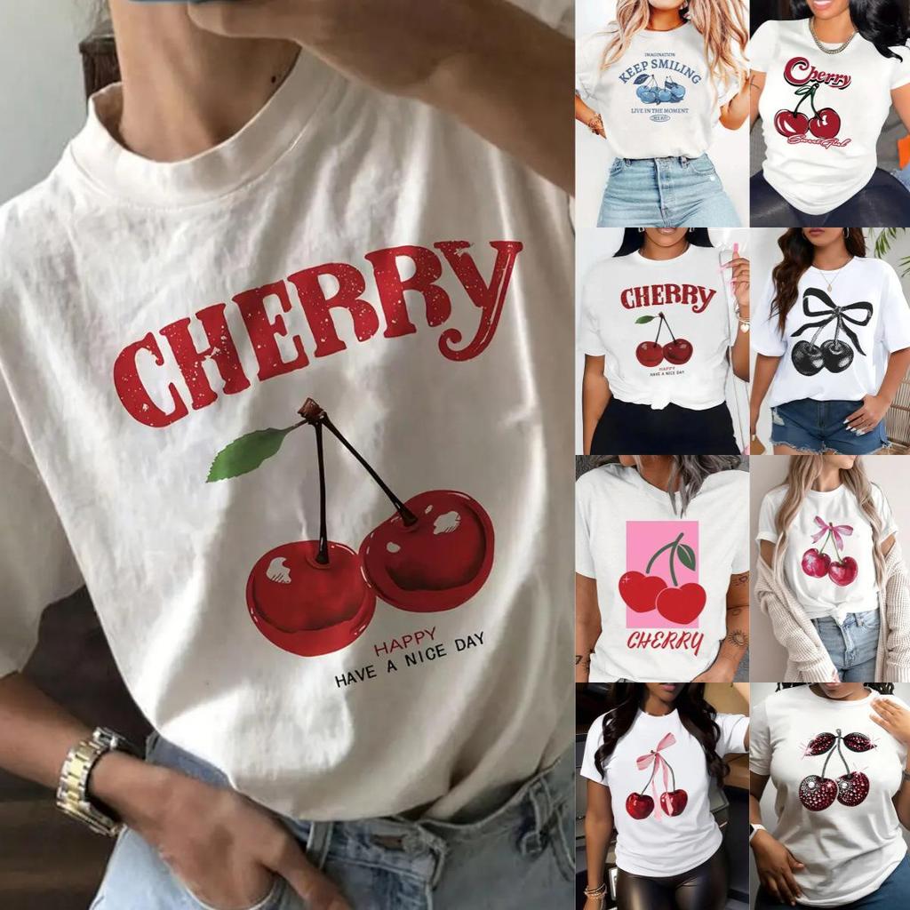 Discover the charm of European and American style with this stylish women's top, featuring a delightful cherry print. Crafted from soft, high-quality polyester, it offers both comfort and durability. The top is designed with short sleeves, making it perfect for warm days, while the round neckline adds a classic touch to its modern appeal. Enjoy free shipping on this trendy addition to your wardrobe.