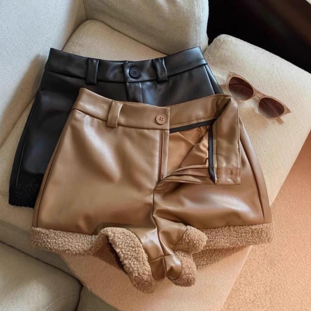 Maillard Women's Spring Retro Fur Spliced PU Leather Shorts & High-End Petite Leggings