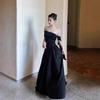 Czarna sukienka w stylu francuskim Hepburn z odkrytymi ramionami: Lato Slim Fit, Detal z wstążką