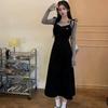 Zainspirowany Hepburnem damski czarny komplet dwuczęściowy: mały top na ramiączkach i długa sukienka - Jesień 2024