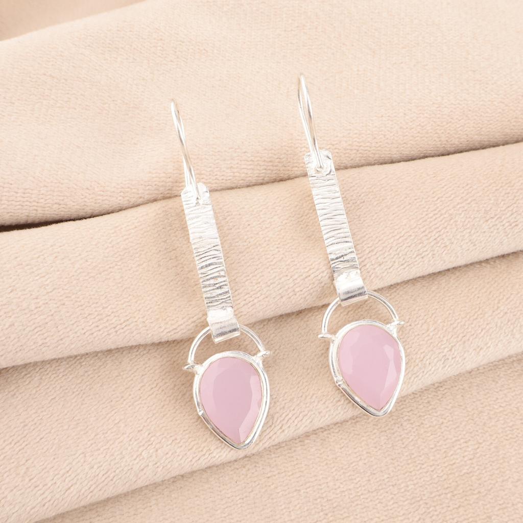 Różowy Chalcedon Kamień Szlachetny Srebro Próby 925 Biżuteria Ręcznie Robione Wiszące Kolczyki 2,3" EE-166-15