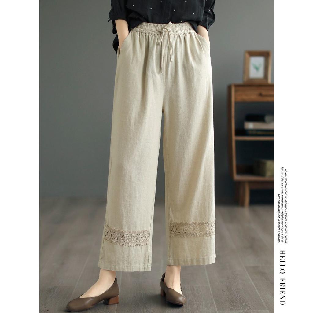 2025 Eleganckie Krótkie Bawełniane Spodnie Proste Damskie Retro Duży Rozmiar Luźne Spodnie z Panelami z Koronki Wiosna Lato Casual Szerokie Nogawki