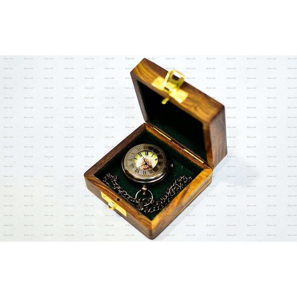 Świat Zegarka Kieszonkowego w Stylu Vintage Antycznym z Mosiądzu z Przyciskiem do Otwierania 2" z Drewnianym Pudełkiem