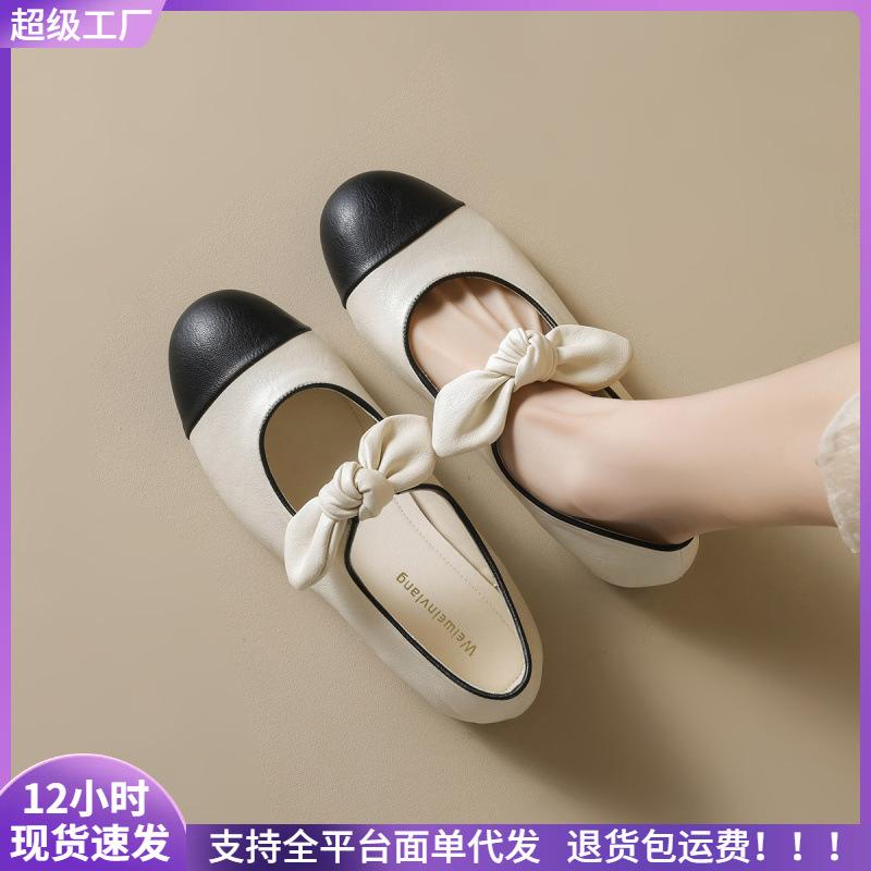 Round head Mary Jane shoes bow black and white color matching light mouth flat sole shoes women