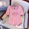 Letter Printing Contrasting Color Splicing Square Neck Short-sleeved T-shirt Summer Fat and Thin Loose Top