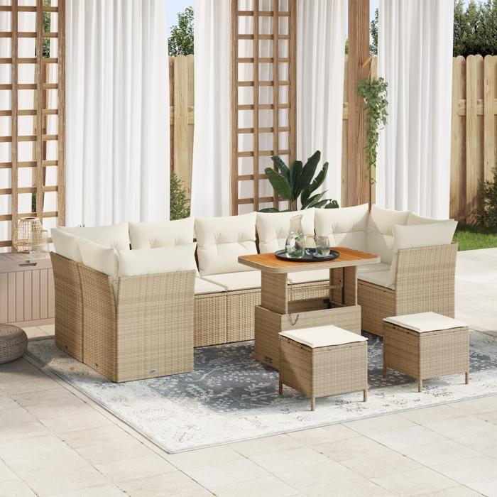 VidaXL Ensemble de Canapés de Jardin 10 Pièces avec Coussins Beige Poly Rotin Acacia 3361471