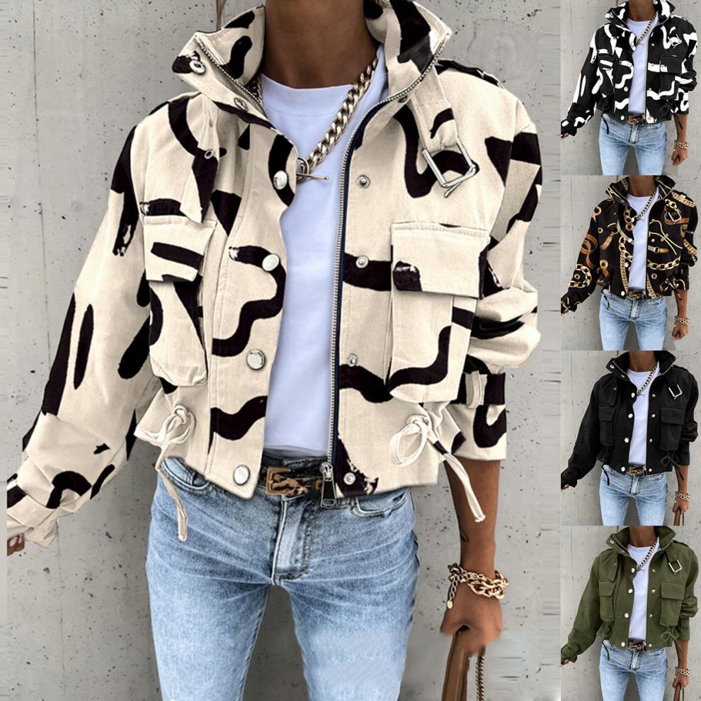 Women's Short Windbreaker Jacket Printed Workwear Long Sleeve Drawstring Coat