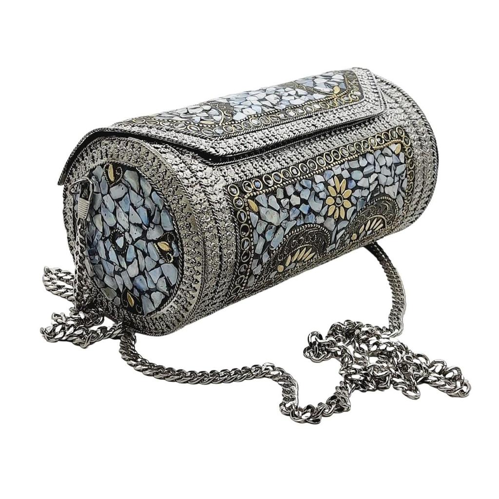 Kobieca Przyciągająca Wzrok Ręcznie Robiona Cylinder Okrągła Etniczna Srebrna Metalowa Torebka Antyczne Ślubne Puzderko
