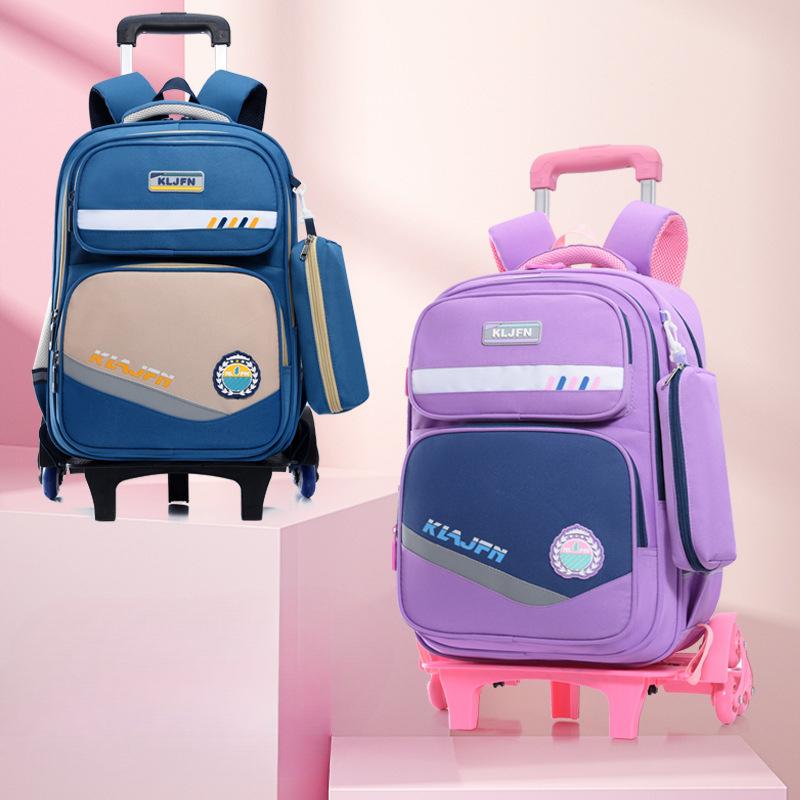 Uczniowie Szkoły Podstawowej Chłopcy i Dziewczęta Wchodzą po Schodach Wodoodporny na Sześciu Kołach Ochrona Krawędzi Redukcja Obciążenia Dziecięca Torba Dźwigniowa