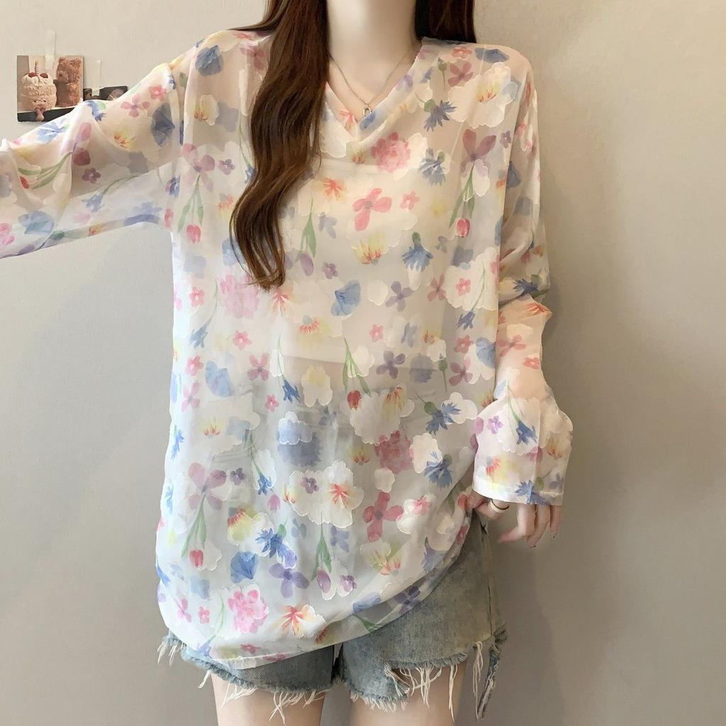 Summer Thin Dopamine Long-Sleeve Sun-Protective Chiffon Blouse Plus-Size Women's Loose Cover-Up Top