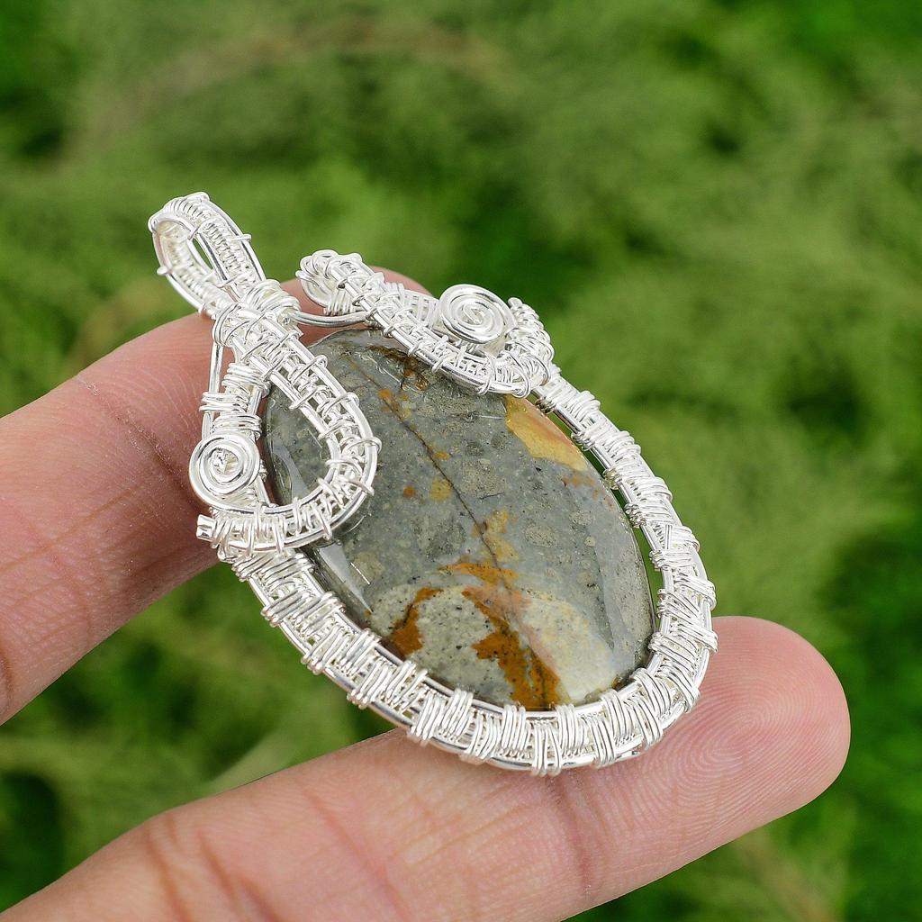 925 Sterling Silver Oval Polychrome Jasper Stone Boho Wire Wrap Pendant Jewelry