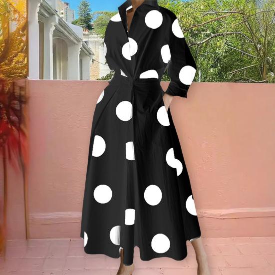 Damska sukienka koszulowa boho z zakładką zapinaną na jeden guzik, w grochy, z długim rękawem, długa maxi, z kołnierzykiem z klapami, z dekoltem w serek, długa rozkloszowana sukienka