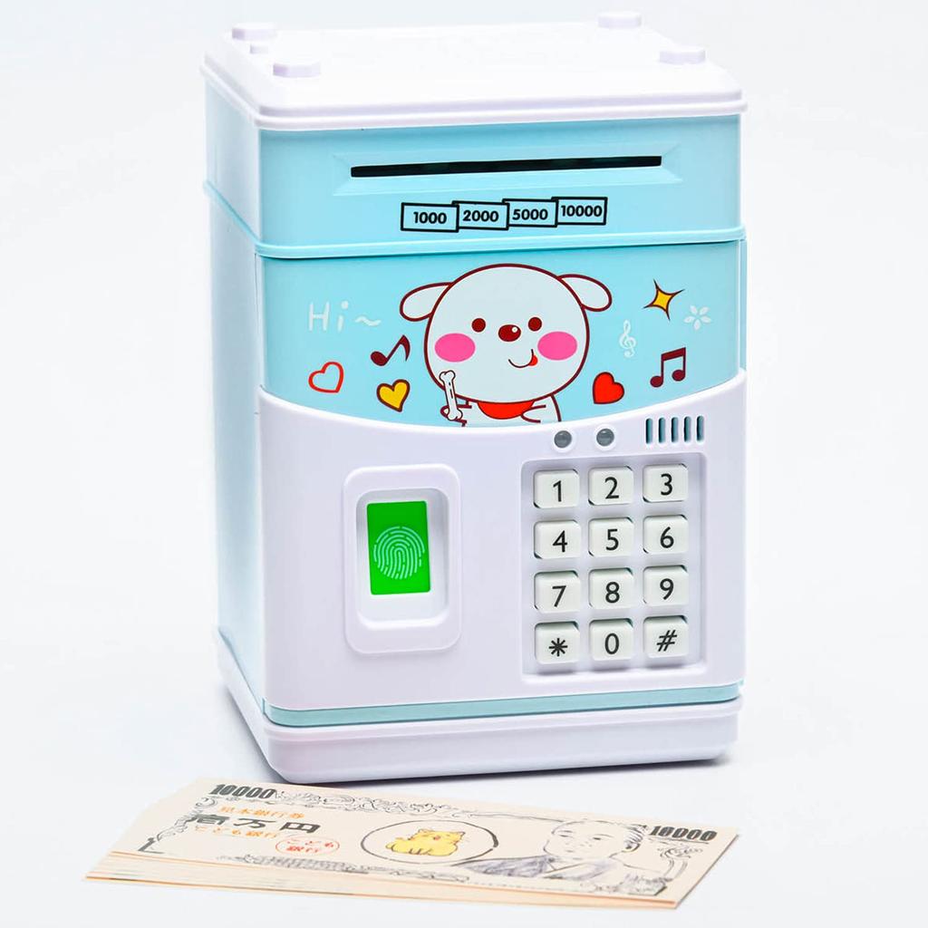 Niebieska skarbonka świnka Lucky Lotto z banknotami, angielskie rymowanki i muzyka, dołączona japońska instrukcja, w kształcie bankomatu, dla dzieci