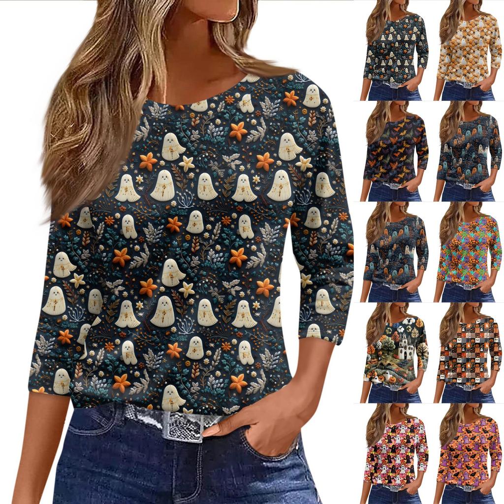 Damska Moda Casual Rękaw Trzy Czwarte Nadruk Halloween Okrągły Dekolt Top