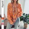 2025 Spring/Summer Bohemian Vacation Style Cotton Print Lace-up Long-sleeved Top Shirt Women