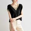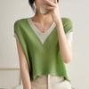 Modne swetry w paski w kontrastowych kolorach, luźne, letnie, nowe, z krótkim rękawem, damskie, koreańskie, eleganckie, z dekoltem w serek, dzianinowy T-shirt z przeszyciami