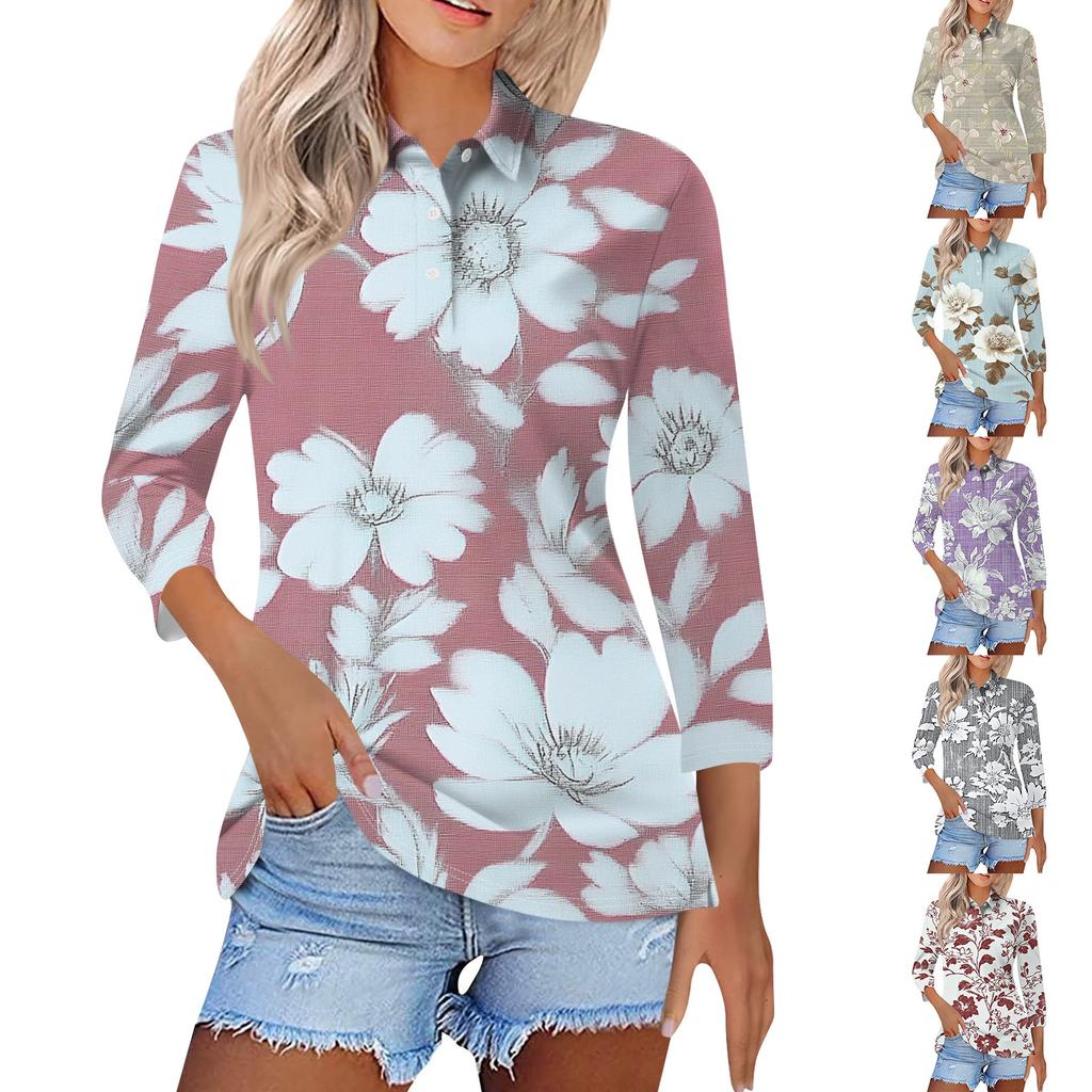 Women's Fashion Casual Button 3/4 Sleeve Vintage Floral Print Lapel Top