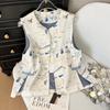 Embroidered button-down vest jacquard brocade weave gold cardigan top