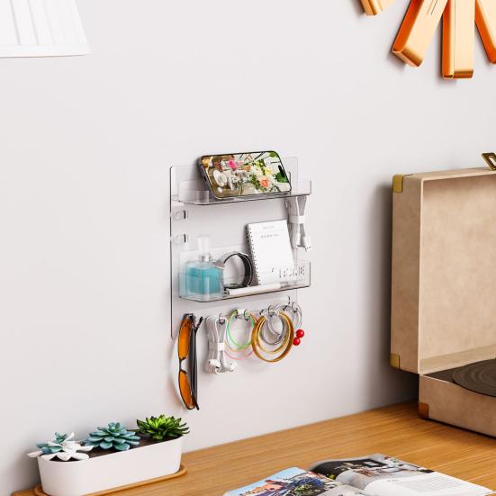 Stojak można łatwo zamontować bez wiercenia, dzięki dołączonej dwustronnej taśmie samoprzylepnej.. Ma dużą nośność do 10 funtów i posiada przegródki do przechowywania telefonów komórkowych, pilotów, tabletów, słuchawek i innych.. Dodatkowo, zawiera 5 haczyków do wieszania akcesoriów i 2 uchwyty kablowe do utrzymywania porządku z przewodami.