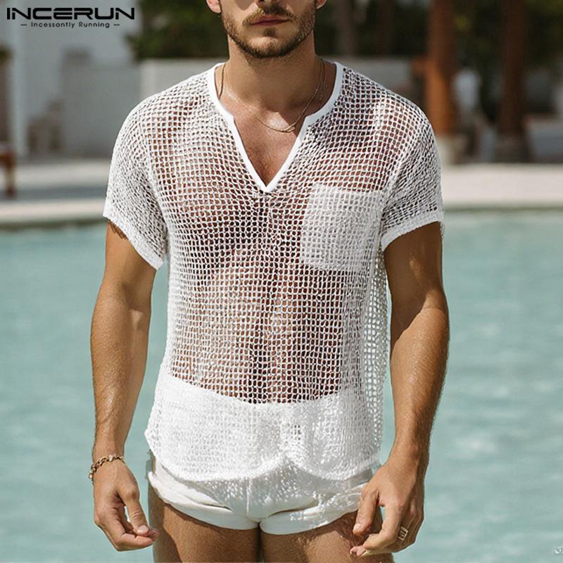 INCERUN Męskie Koszulki z Krótkim Rękawem z Siateczki Przezroczyste Puste Plażowe Top