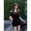 Black off-the-shoulder long sleeve V-neck dress women's spring hot girl foreign style short skirt tight hip skirt