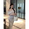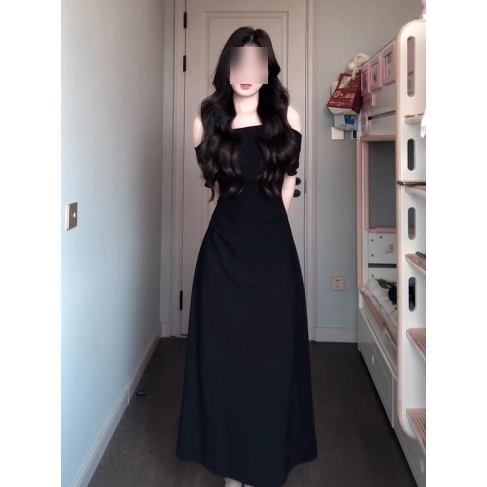 Black one-word shoulder dress women's clothing summer new casual temperament waist-wrapped hip dress