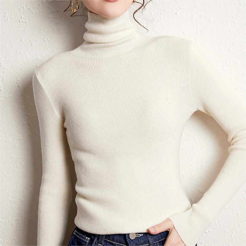 Soft waxy pile-neck knitted bottoming shirt for women, slim spring and autumn style temperament versatile solid color turtleneck bottoming
