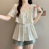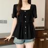 Women's Waist Cinched Short Sleeved T-shirt Square Collar Hollowed Out Design Tops Korean Minimalist Lady Clothing