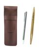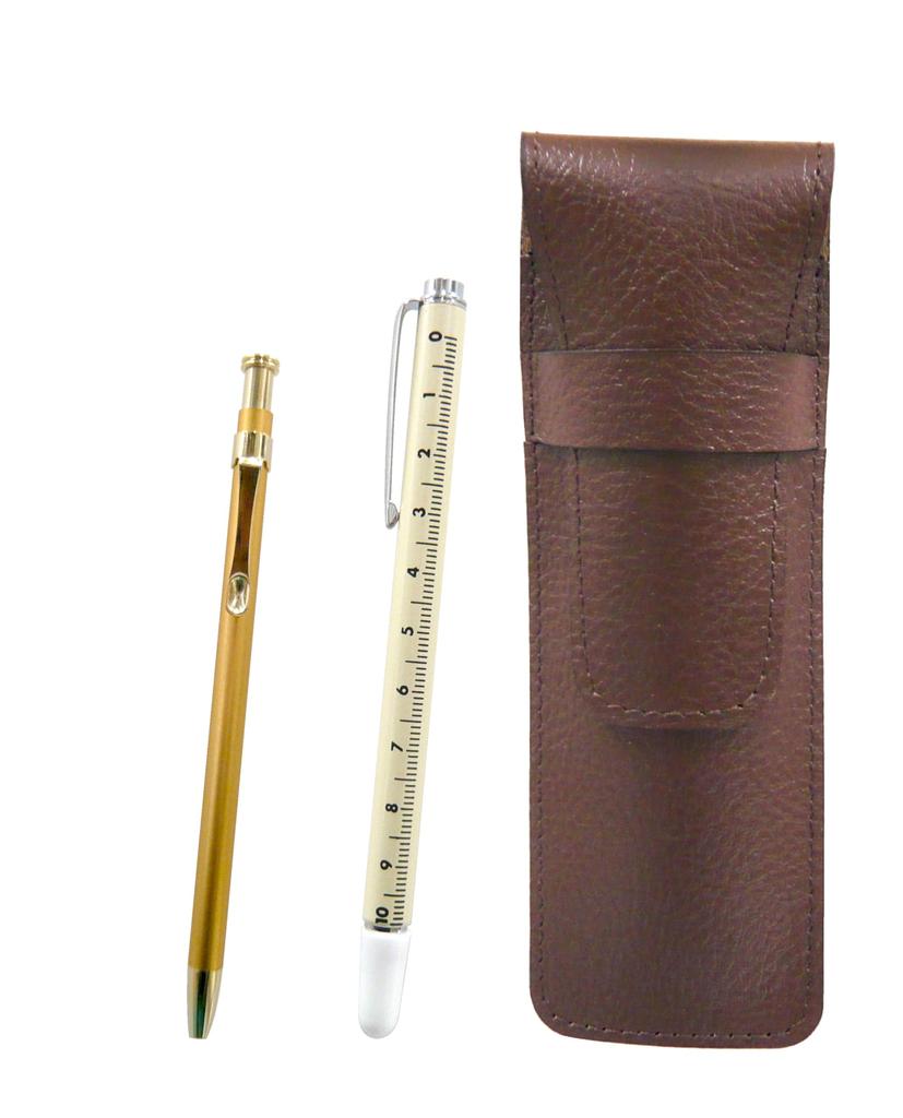 Zestaw skórzanego piórnika wyprodukowanego w Japonii, metalowego wskaźnika wyprodukowanego w Japonii oraz długopisu.