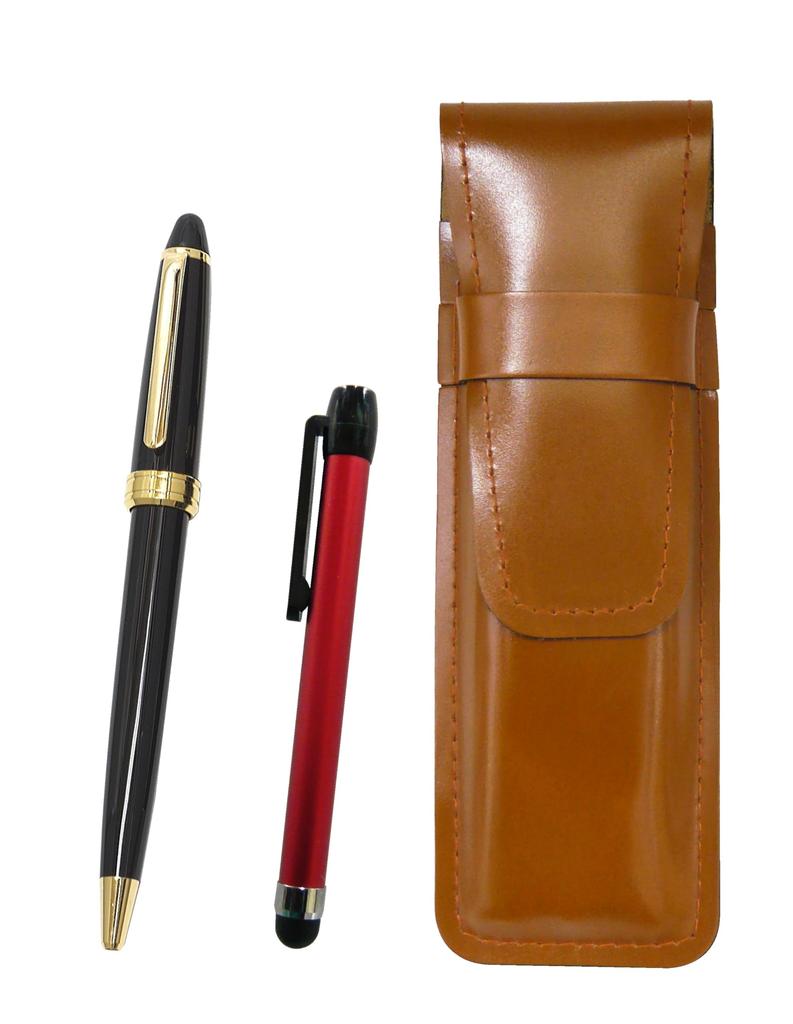 Slim Brown Leather Pencil Case with Red Metal Touch Stick and Black Neo Ballpoint Pen Set D-600 (ASC-ALR-600B-B)