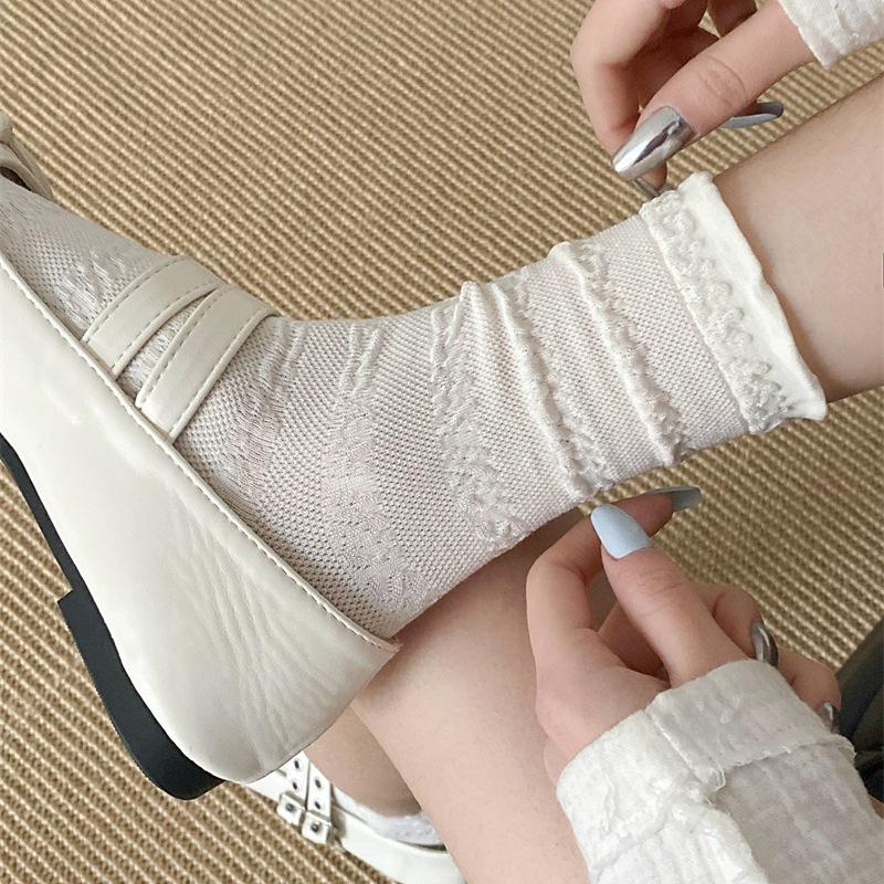 Women's Spring Thin Solid Color Mesh Boneless Pleat Versatile Medium Tube Cotton Socks