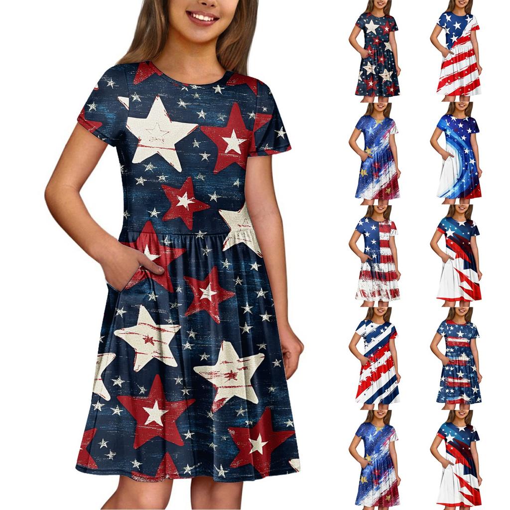 Dziewczęca Letnia Sukienka Jednolity Kolor i Nadruk Bez Rękawów Sukienka z Kieszenią Sukienka Codzienna Krótki Rękaw Sukienka na Imprezę