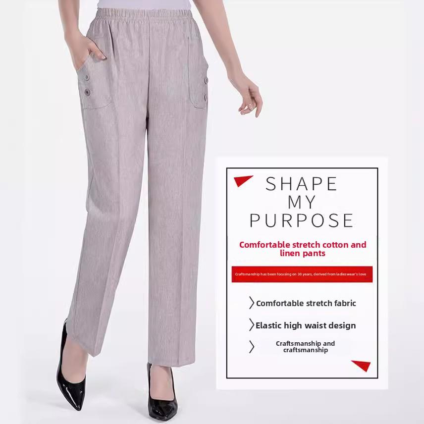 Spodnie damskie na wiosnę i lato w średnim wieku, spodnie dla matek z wysokim stanem i elastyczną talią i prostymi nogawkami, luźne spodnie dziewięciopunktowe dla osób starszych
