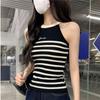 Sweter dzianinowy z dekoltem halter, w paski, z haftowanym napisem, top na ramiączkach, top halter damski, bez rękawów