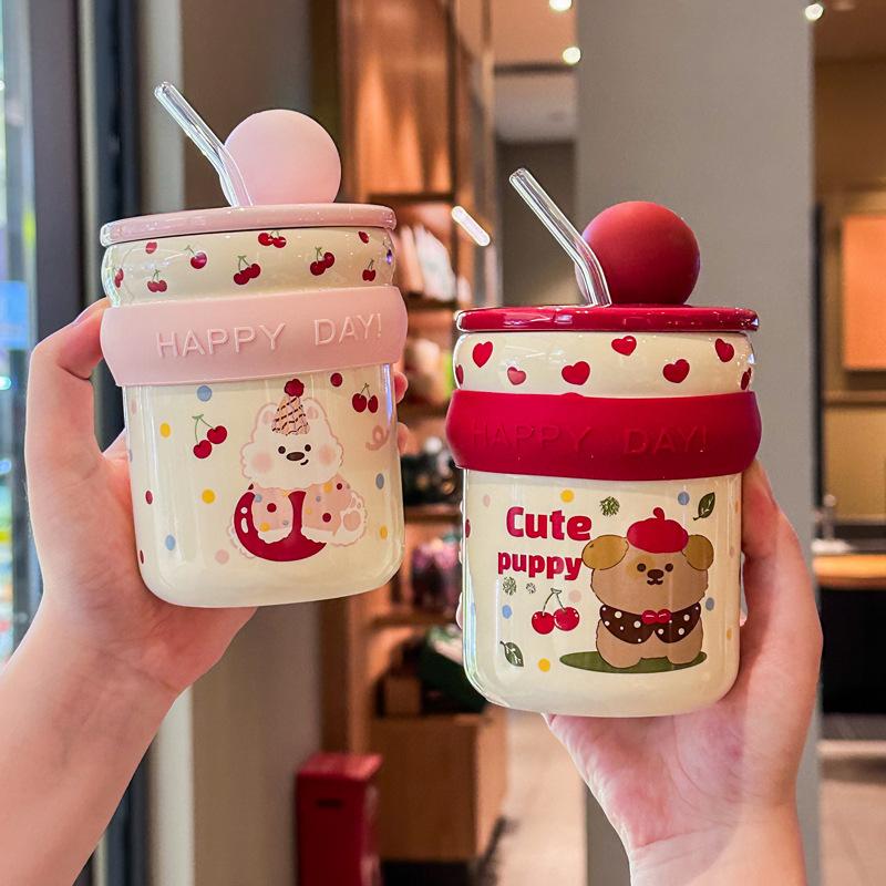 High looking Cute Ball Cute Pet Ceramic Water Cup New Children's Straw Mug Girl Birthday Gift