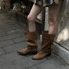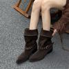 Vintage Pointed Toe Pleated Woman Western Cowboy Boots Fashion Slip On Thick Heel Knight Booties