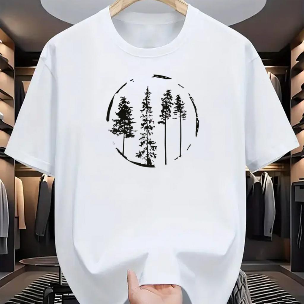 Męska Letnia 100% Bawełna Modna Casualowa Luźna Koszulka Top T-shirt ze Wzorem Drzewa Leśnego z Nadrukiem Sportowa Okrągły Dekolt Krótki Rękaw