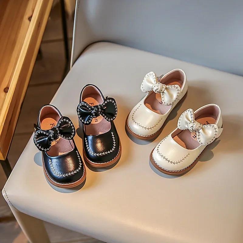 Dziecięce Skórzane Buty Dziewczęce Modne Miękkie Mokasyny z Węzłem 2024 Nowe Dziewczęce Casualowe Buty Księżniczki na Imprezę Ślub Płaskie w Jednolitym Kolorze