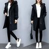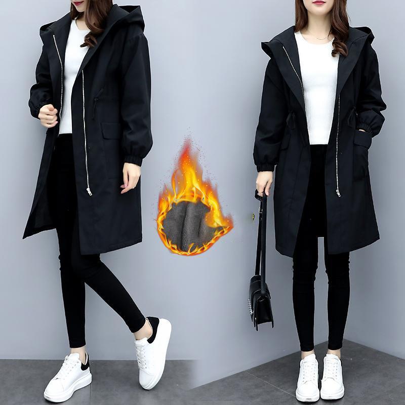 Płaszcz trenczowy z grubego polaru damski średniej długości damski jesienno-zimowy z kapturem ocieplany bawełną