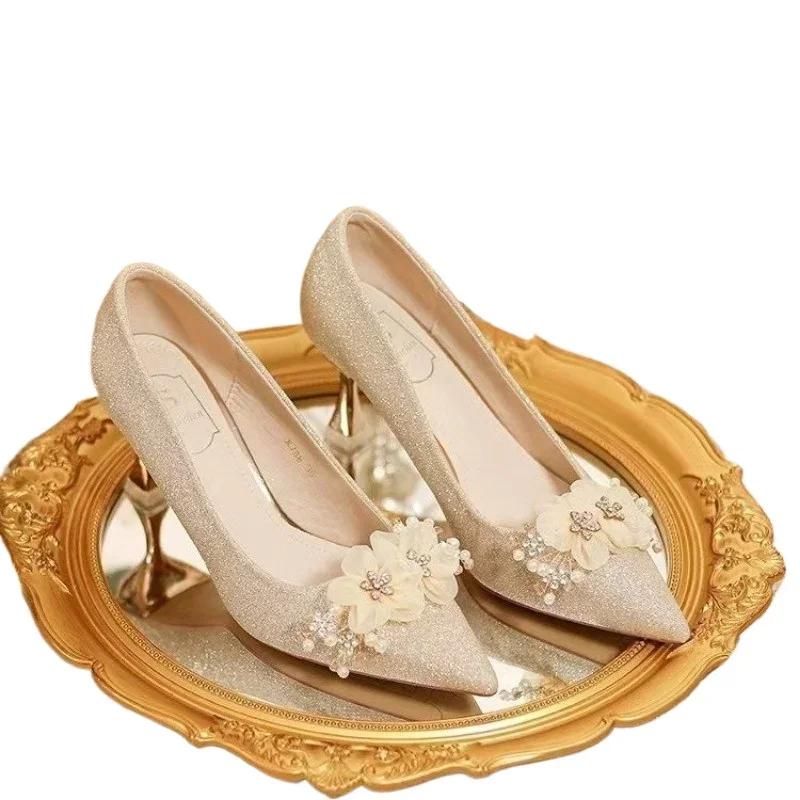 Ladies Shoes 2025 Slip on Women's High Heels Fashion Wedding Pumps Women Floral Crystal Pearl Pointed Toe Thin Heels Shoes Women