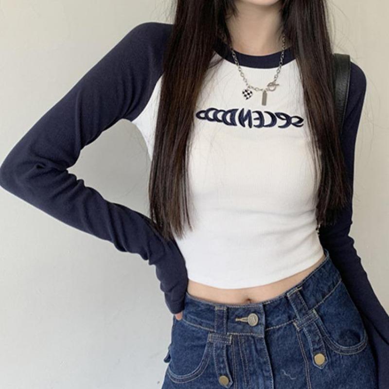 2KWEIRD Letter Print T-Shirt Women Spring Long Sleeve Patchwork Tops Fashion Retro Contrast Color Crop Top Hot Girl Kpop Skinny Y2K Tees