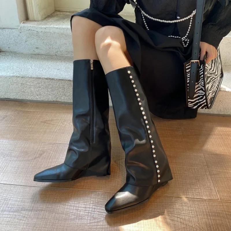 Pearl Pants Knee High Boots Square Head Wedge Heel High Heel Sleeve Boots Sexy Women's Boots Fashion Casual New
