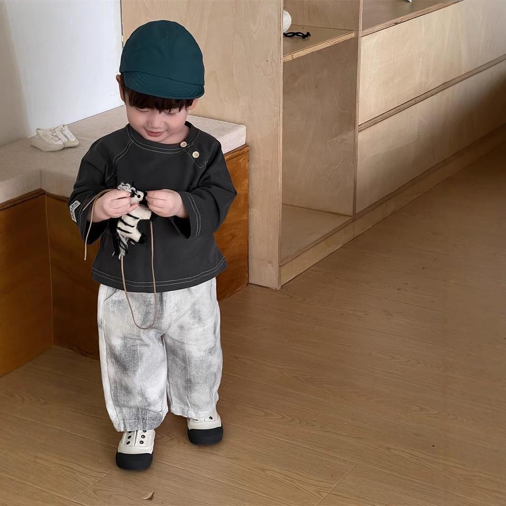 Dziecięcy Jesień 2025 Nowy Zestaw T-shirtu z Okrągłym Dekoltem i Dżinsów - Chłopięca Odzież Jesienna w Stylu Koreańskim