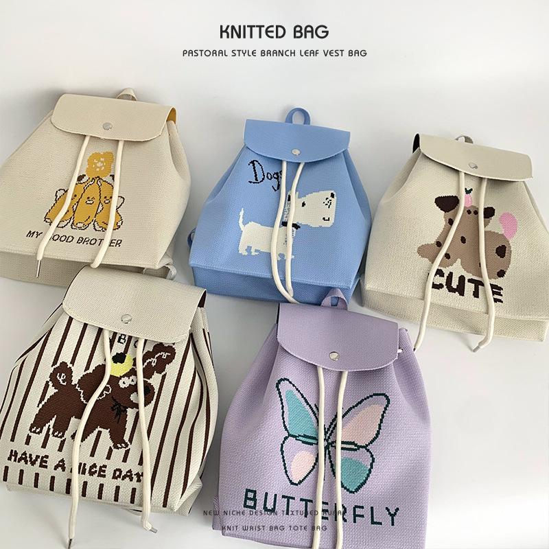 Women's Korean-Style Cartoon Animal Knitted Backpack - Versatile, Large Capacity, Portable Bucket Bag