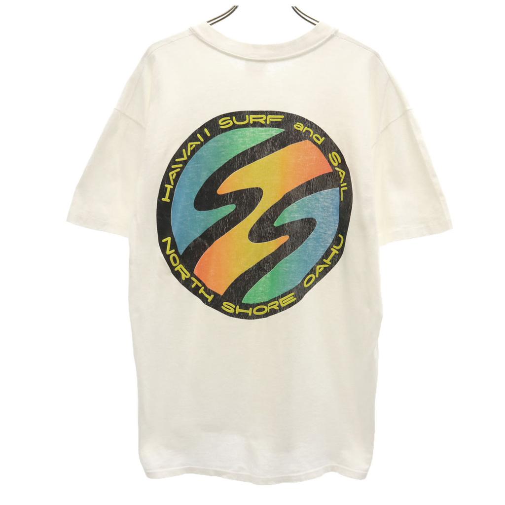 This is an old print T-shirt from the 90s. There is repair and peeling on the back neckline, and staining on both sides and the neckline. The print is cracked and there is fluffing throughout. Please understand that this is a used item before purchasing.