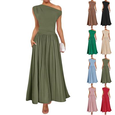Damska suknia wieczorowa Na jedno ramię, wzburzona, plisowana, wysoka talia, Jednolity kolor, Bez rękawów, Linia A, z dużym obszyciem, koktajlowa, maksi, sukienka piłka.